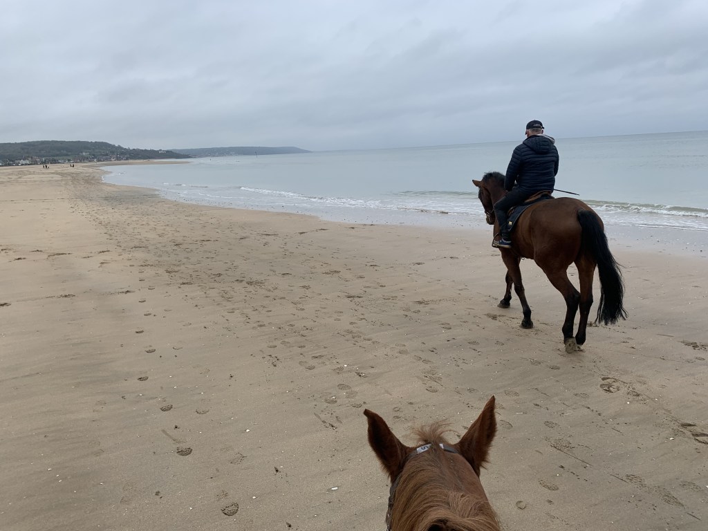 No safety lesson or review required, I hopped on Tara, my Dutch Warmblood, and we set off to ride along the iconic Deauville beach front, previously strolled by many celebrities, billionaires, and Parisians alike. I asked my lovely guide a question about the beach and he didn’t seem to hear me (or simply ignored me). I took this as him saying “the view speaks for itself.” And he was right.
